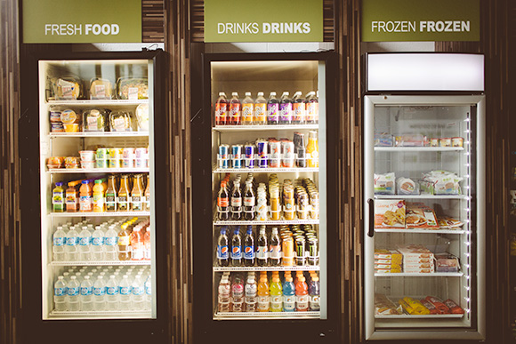 The MicroMarkets feature a few coolers filled with drinks, sandwiches, and snacks. They are next to shelves of other snacks, a coffee maker, and self-checkout kiosk. All of it is primarily based on the honor system so it’s open 24/7, accessible to anyone in the building, and convenient to its patrons. Check out a video of it here.