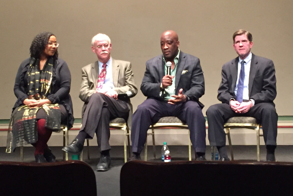 Following introductory remarks, the event’s moderator, Jennifer White of Michigan Radio, invited the following panelists to the stage to make brief presentations: Hunter Morrison, director of Vibrant NEO, a regional plan for northeast Ohio; Michael Ford, CEO of the Regional Transit Authority for Southeast Michigan; John Austin, director of the Brookings Institution’s Great Lakes Economic Initiative; and Ponsella Hardaway, executive director of Metropolitan Organizing Strategy Enabling Strength (MOSES).