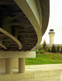 The air traffic control tower and new bridge construction at the Detroit Airport