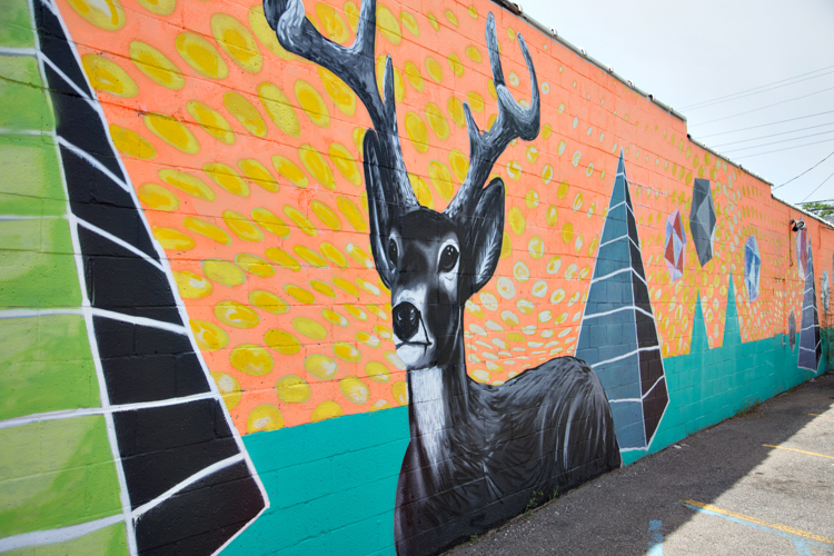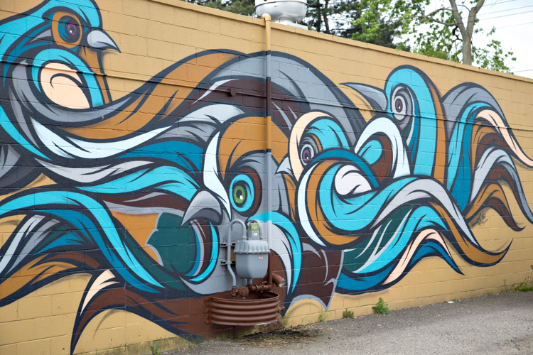 Self taught artist Malt (aka BrownBagDetroit) created this fascinating work on the wall of Elwin & Company. Malt works with both aerosol and acrylic painting techniques, exploring themes of nature across a broad body of work.
