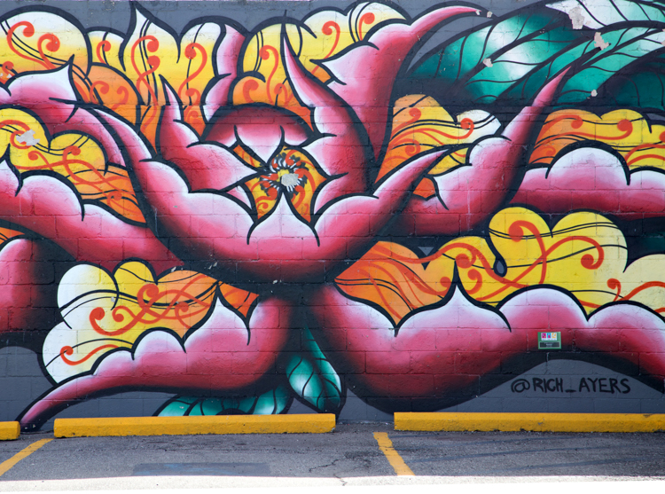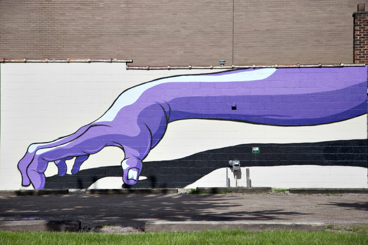 On the wall of Nova Chiropractic, Paolo Pedini’s striking work brightens the view for pedestrians. Pedini has worked on several murals around Detroit and says he starts his work by creating background colors and patterns, later adding foreground figures that are a stark contrast to previous layers. More elements like spray painting stencil work are added to further the interactions between layers. He says he finds every public artwork he does extremely rewarding.
