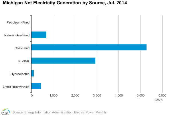 But the study also notes that those old, dirty plants are also responsible for approximately 29 percent of Michigan’s generation capacity. Michigan is a coal-heavy state; 54 percent of its electricity was derived from coal in 2012, according to the U.S. Energy Information Administration. Michigan also had more natural gas storage capacity than any other state in 2011 and is rich in natural gas resources.