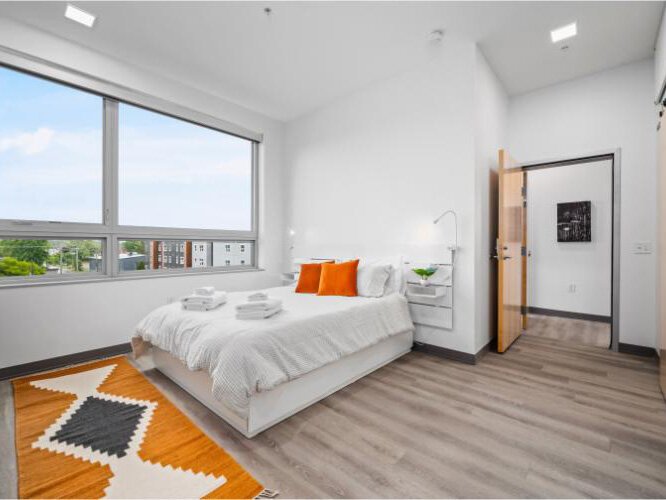 The co-op features 18 housing units over two floors, made up of studio, one-bedroom and two-bedroom apartments. The space also includes shared common rooms, laundry, a gym, deck and balcony. Apartment rents are determined by income and 75 percent of the units are offered below market rate, with units starting as low as $525 for a suite, which is a private bedroom with a shared bathroom and living areas.