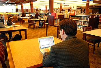 An even greater percentage of patrons take advantage of the Southfield Library’s Wi-Fi connection. Dave Ewick, the city librarian, estimates more than 80 percent of the 2,000 to 4,000 patrons each day either use the library’s computers or bring their own. Every bit of the 127,000 square feet of the building, from the lobby to the bathroom stalls, has been Wi-Fi friendly since its 2004 opening.