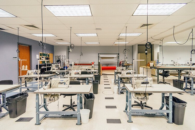 On a cold morning in December, the interior of Detroit Sewn is warm and inviting. Karen Buscemi, CEO of the full-service contract sewing and dye sublimation company, stands in an aisleway between rows of industrial sewing machines. Gathered around a worktable, a handful of sewers discuss their projects.