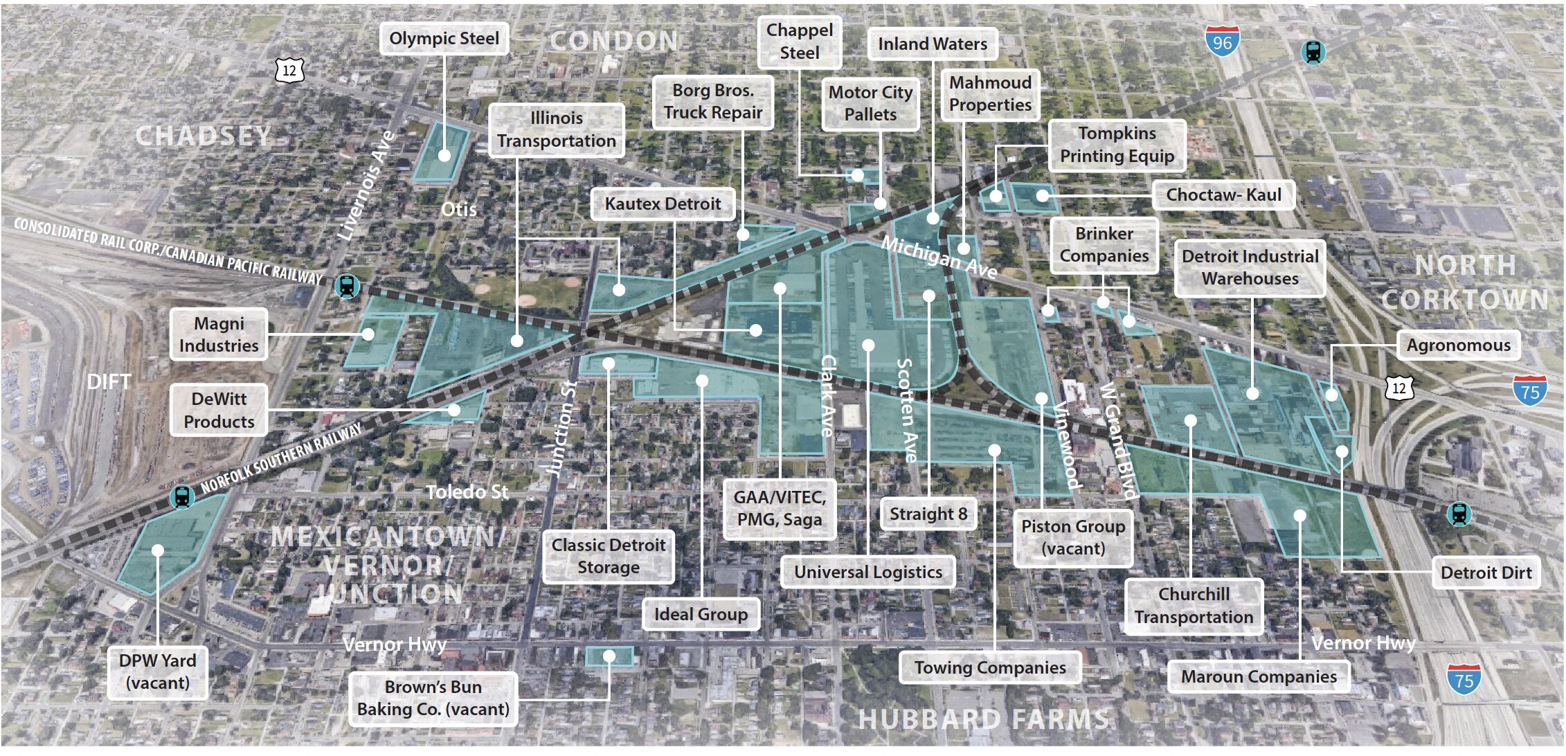 A Detroit Future City report released in 2017 identified that there are over 900 vacant industrial sites in Detroit, many of which are embedded in residential neighborhoods. Tom Goddeeris, DFC’s COO, explains that the premise of the newer study was to look at how older industrial areas that are embedded within Southwest Detroit neighborhoods could be put into productive use to serve the community.