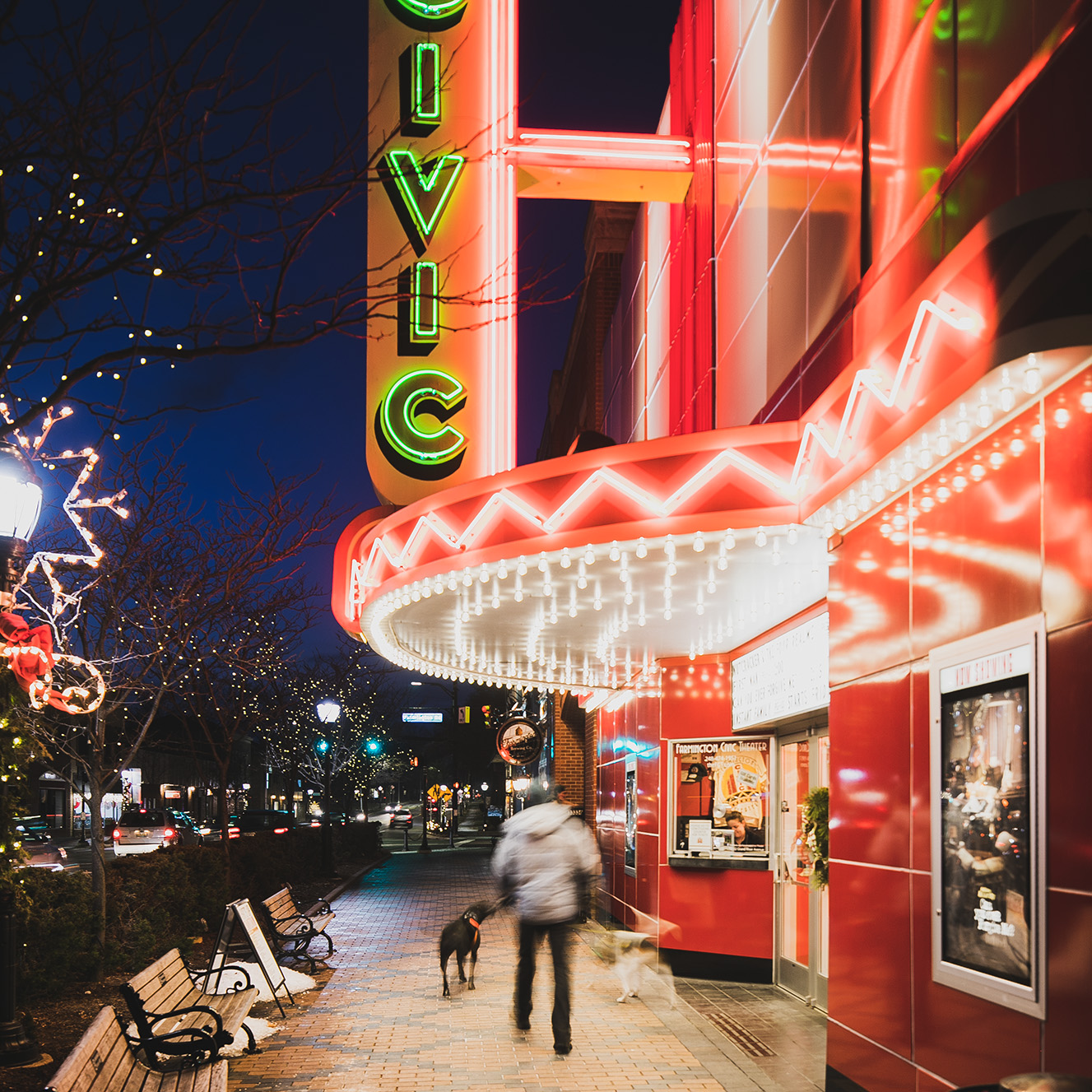 It was designed in the Art Moderne style by legendary architect C. Howard Crane, who also designed Detroit’s Fox Theatre and the Detroit Institute of Arts, the Civic Theater was built on the site of what had once, before its demolition, been an A&P Supermarket. In the early days, air conditioning was among the theater’s most notable amenities; and on Wednesday nights, the theater had promotional giveaways of things like dishes, or Constance Bennett makeup. But it’s the Civic’s blade marquee that has since come to define downtown Farmington’s look and spirit.