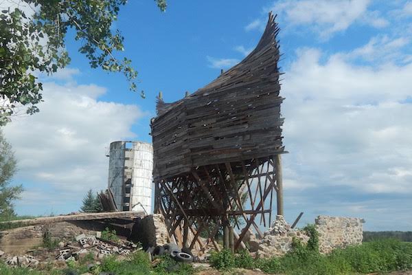 But it turns out that rain has come and gone, though the skies still threaten. As I approach by car, Hocking is at the project site, burning heaps of wood in what looks like a pyre from another era. The piece in progress is visible from the road. It is behind some trees and next to what looks like what remains of an extremely solid silo.