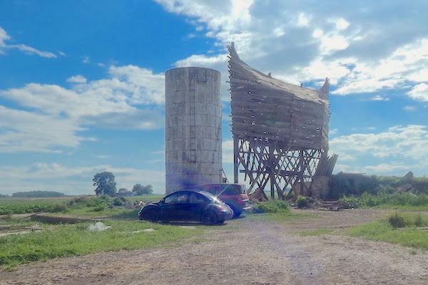 Before I reach Hocking’s work site — on Fehner Road just off Oak Beach Road about 1.5 miles from the water — rain pours down, around Cass City and again just south of Bad Axe. I call Scott to see if he’s there. He’s seeing a chiropractor in Caseville today to address a pinched nerve in neck, an injury that occurred a few weeks prior while building the ark. The weather might be even crazier up there, too, which could alter our plans.