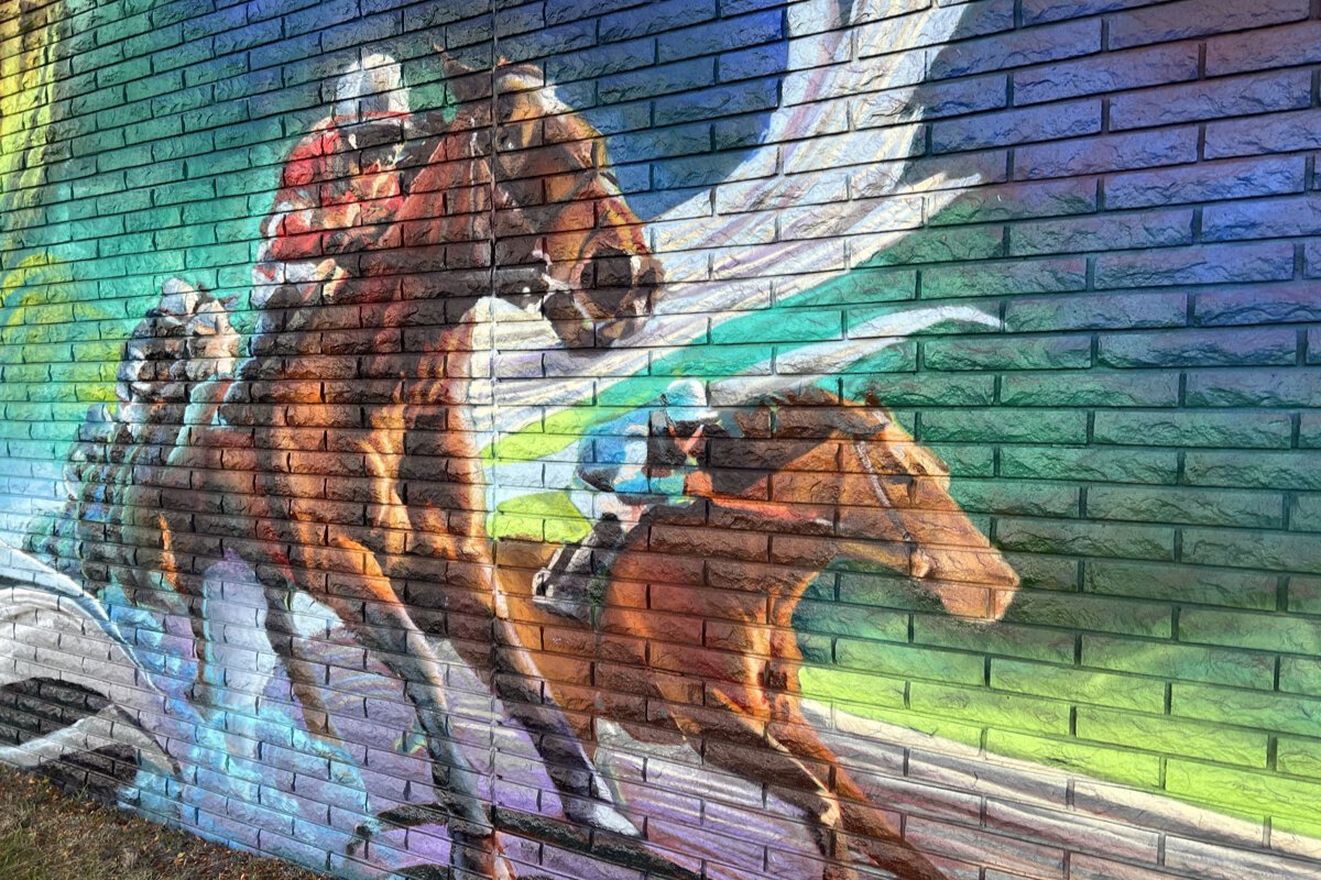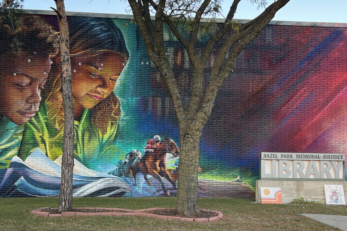 After library staff passed the community survey results to the DIA and Zach Curtis, a draft was approved and Curtis set to work in September. The result incorporates the most common submitted themes to feature two children reading a book as racehorses run out of the pages. A World War II era plane carries a Hazel Park banner. And there’s color. Lots and lots of color that has transformed the entire intersection with a blast of vibrancy.