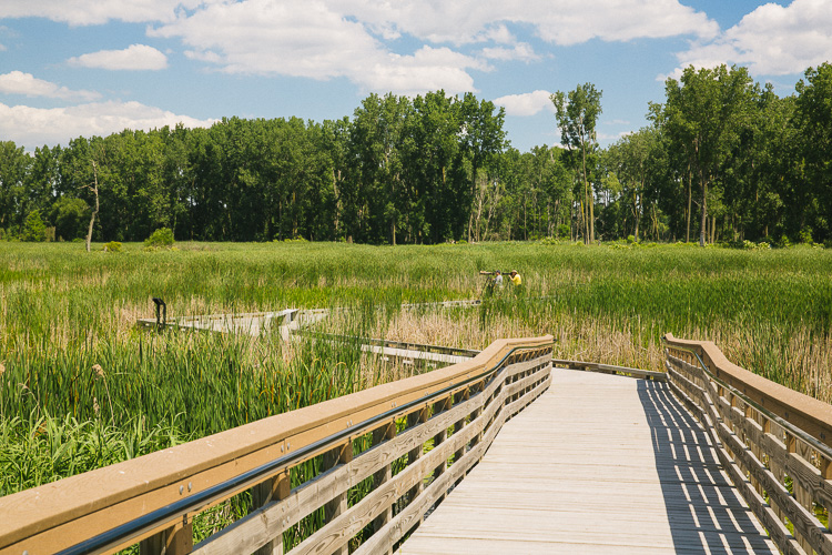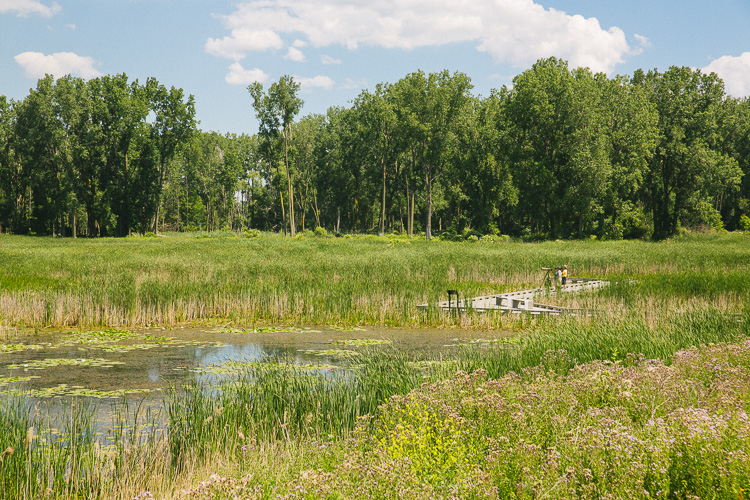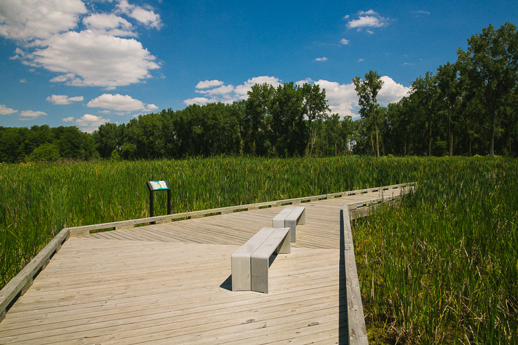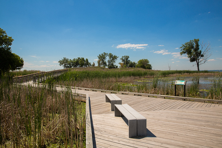 Today, the restored Black Creek and Point Rosa marshes resemble wetlands that once existed at the mouth of the Clinton River. A boardwalk extending about one-fifth of a mile into the marsh is enough to transport a visitor from the parking lot into an area of still water where you might see a muskrat come up with a fish, or a turtle sitting idle next to a duck, or rabbits, or even a deer in the brush.