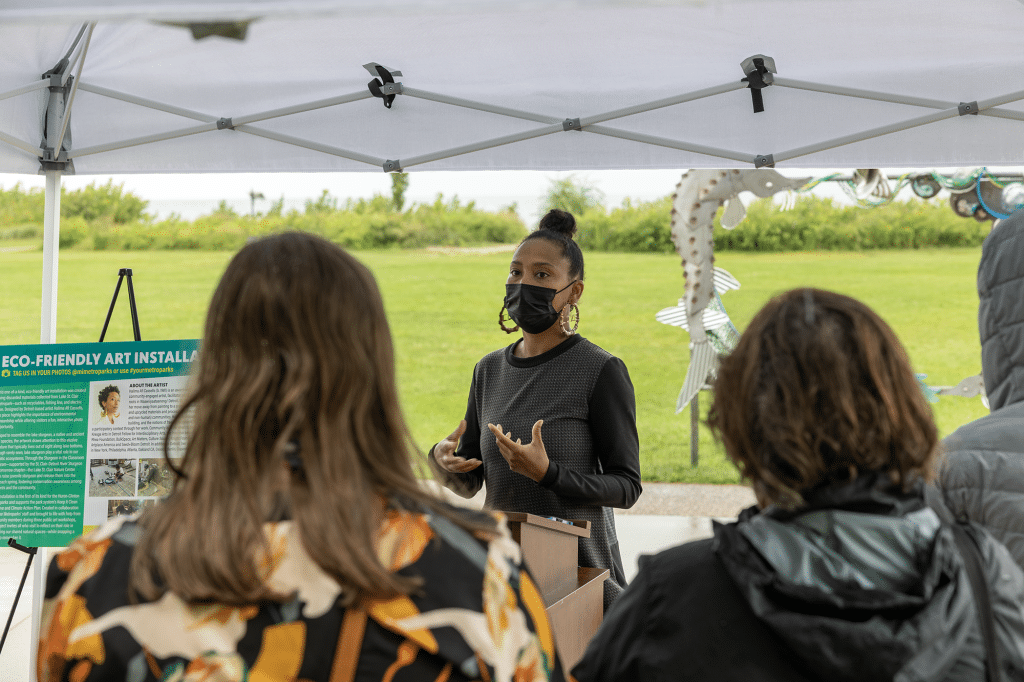 “[Metroparks staff] wanted something that would live outdoors that could speak to [sturgeon conservation], as well as be a reminder for folks to be conscious of their materials and pick up after themselves and just know that all of our choices have an impact,” Cassells says.