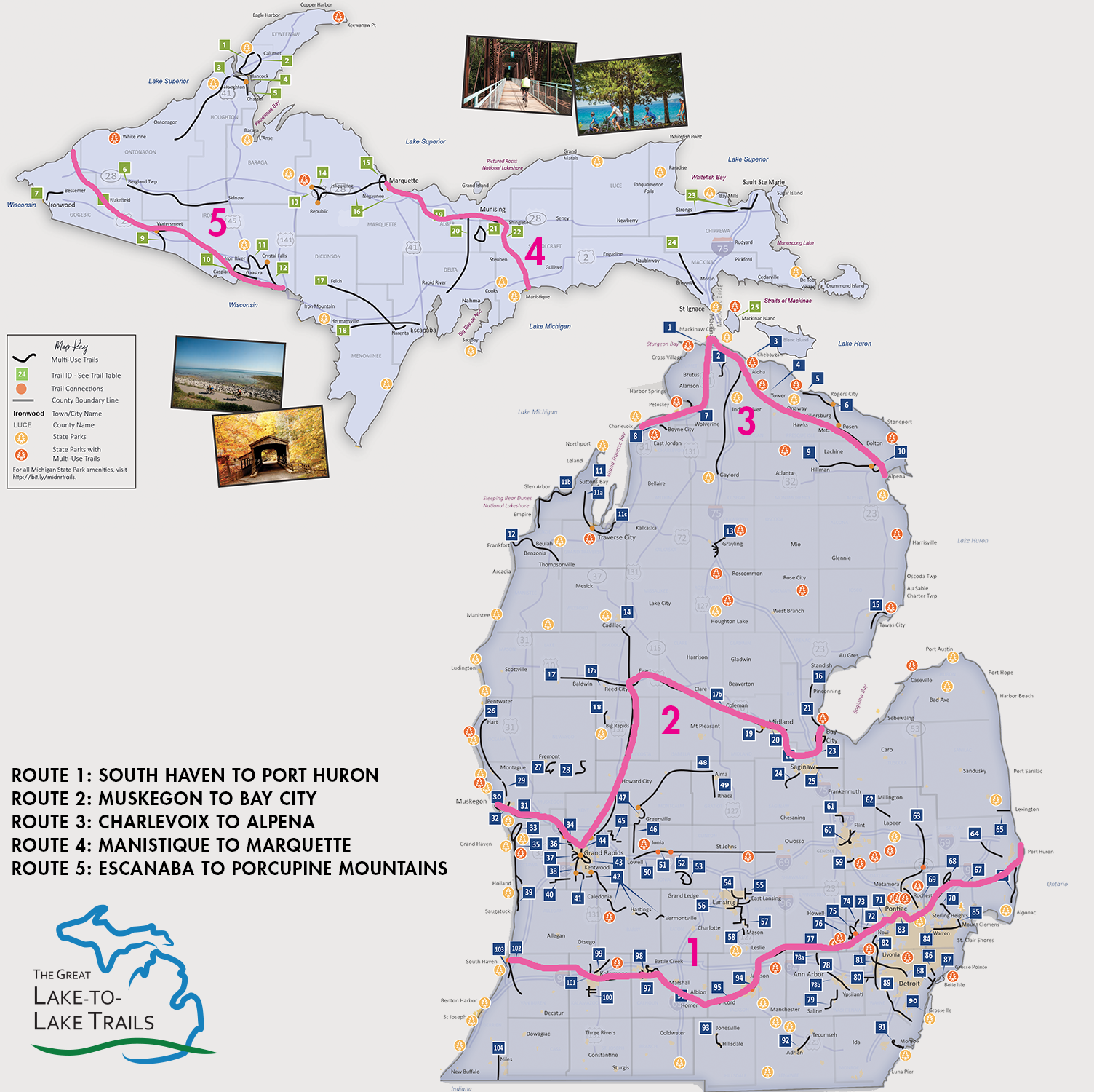 Michigan has five Great Lake to Lake Trails that reach from one Great Lake to another. Route 1 connects Lake Michigan at South Haven to Lake Huron at Port Huron. Part of this cross-state trail goes right through Metro Detroit, along the former Michigan Air Line and Grand Trunk railroad lines: From west to east, it includes the Huron Valley Trail, the soon-to-be-finished Michigan Air Line Trail, the West Bloomfield Trail, the Clinton River Trail, and the Macomb Orchard Trail.