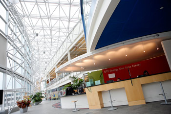 The building, which faces a sustainably-landscaped quadrangle, boasts a 10,000 square-foot green roof, geothermal heating, and utilizes wood such as bamboo—which can replenish itself in as quickly as six weeks. The roots of the sedum planted on the roof filters any rainwater that is not evaporated back into the atmosphere before running into the Rouge River. Some of the water, however, is captured in a cistern so that it can be used to flush the building’s toilets.