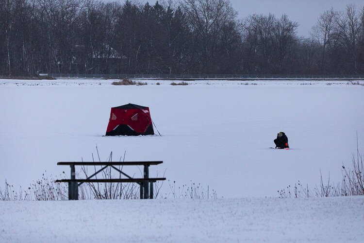 The work Longo is talking about can vary, depending on the person, the state of the ice, and the tools they have at hand. One ice fisher might just take a bucket and hand auger, drill a hole, and sit there all day waiting for a bite. Another might use an electric auger and move around the lake or pond looking for the best spot to fish. Still another might set up shop in an ice shanty with a portable heater, hanging out  with friends and occasionally moving the portable shed around.