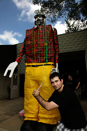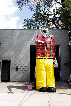 Finally, the moment they’re all waiting for arrives. The paper is torn away to reveal a two-story likeness of Canadian television host Red Green, his plaid shirt made from duct tape and Tyvek plastic sheeting glinting in the sun. Moving his massive wood-framed arms and raising and lowering gray eyebrows, he roars a welcome to the assembled crowd.