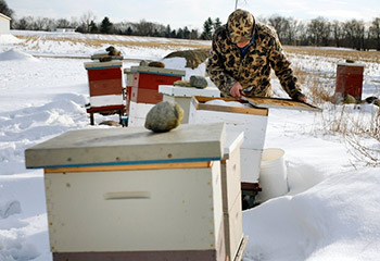 The sun is out for a change. It’s beating down on about a dozen white, wooden boxes. They’re stacked up behind Roger Sutherland’s small pole barn, which is behind his house located in the more rural part of Ann Arbor. The snow is melting a bit, dripping down from the roof to the four inches still on the ground. The trees are bare, and Sutherland’s holding a snow shovel. The scene doesn’t exactly scream “bee season.” Yet, there it is. A low roaring buzz, hundreds of bees piling out of these boxes. If it weren’t for the snow and the winter coat and the snow shovel, you’d think it was spring.
