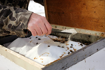 “Do you know what that is?” he asks, beaming at the sight of his bees. He’s pointing down to hundreds of little amber spots pocking the surface of the heavy snow. “That’s bee poop.” And it’s everywhere.