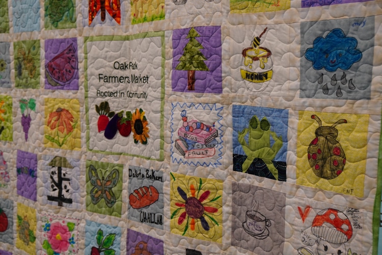 Each twin-size quilt features 92 individually drawn squares from attendees of the city’s farmers market from 2024 to 2025, who were welcome to draw a square that represented a piece of the community. The 465 pieces were put together by Amy Lumley and quilted by Keroline Garrett. The project took over 1,600 hours to complete, and volunteers worked from 9 a.m. to 2 p.m. during the farmers’ market to give residents the chance to participate.