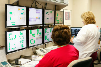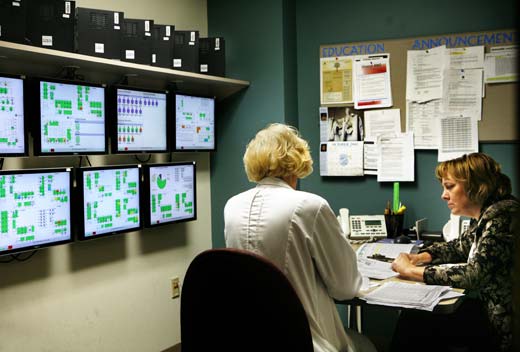 “The View’s” control room similarly displays each floor’s bed situation, allowing nurses to properly staff the unit, assess bed availability, and direct housekeepers to rooms more efficiently. Like a miniature version of NASA’s mission control center, a 12-foot by six-foot room boasts seven flat screen computer monitors and a trio of phones.