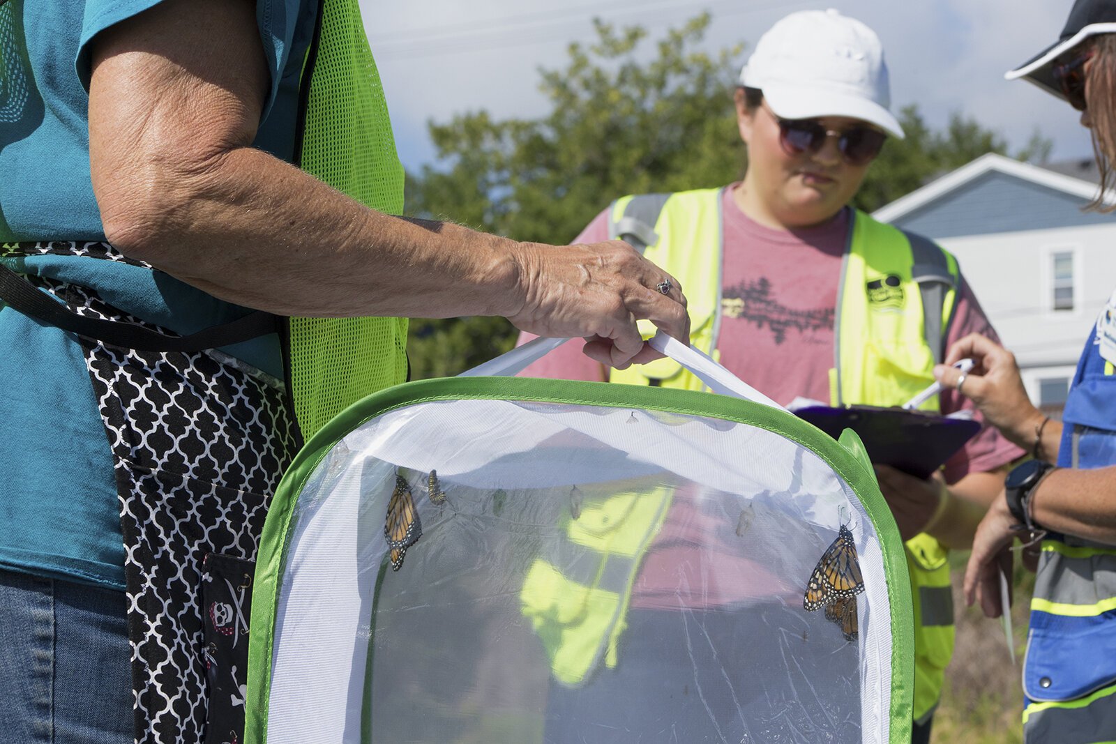 Melissa Kivel, Friends of the St. Clair River restoration coordinator, tags a monarch butterfly by carefully applying a small, lightweight sticker to its wing.