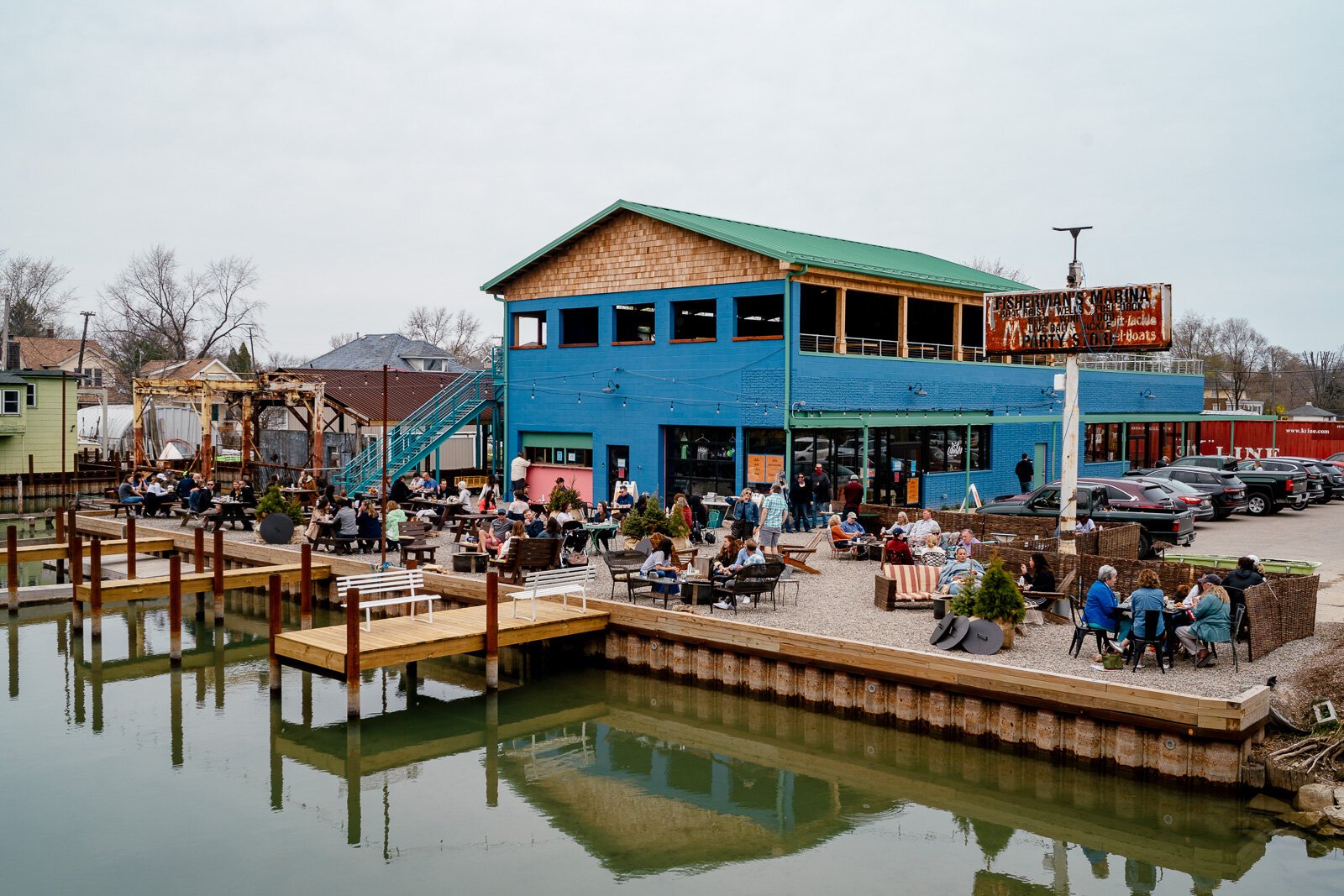 Amongst the fishing boats and kayaks that sit idle and ready behind the homes of Detroit’s canal district in spring, Coriander’s bright blue exterior is a reminder that Detroit summer is in reach. A billboard-like sign for Fisherman’s Marina and Party Store, the last tenant who left the structure more than a decade ago, still stands — emblematic of the fishermen who faithfully gather just across the street at Mariner Park.