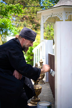 The tree-shaded patio (on this day, covered in helicopters from towering maples) is lined with tables where congregants and lay people can sit and reflect. The church itself is a marvel of authentic antiquity, walls covered in gilded, faithful renderings of the saints hand painted by a local iconographer in the strict, traditional Orthodox style. The grounds exude a grounding air of the handmade and the exultant. And that’s exactly as St. Sabbas’ abbott Rochester Hills native Father Pachomy and the six monks attached would have it (except for the maple helicopters, that is).