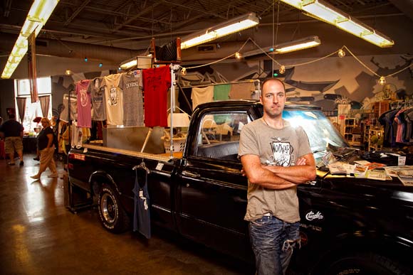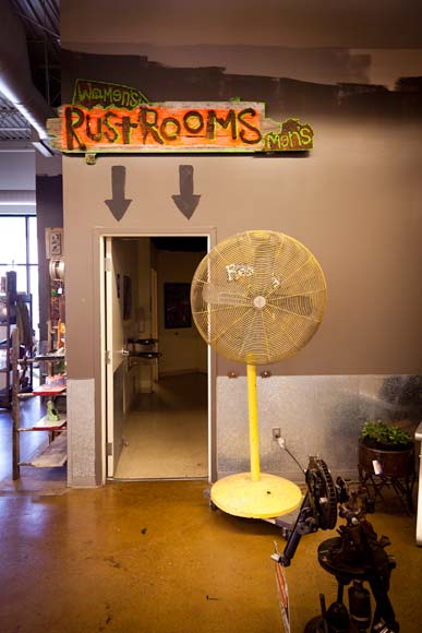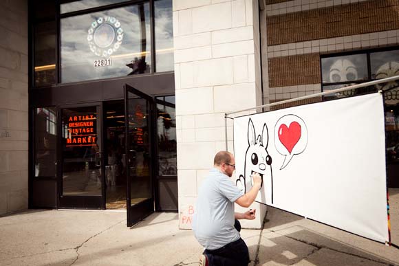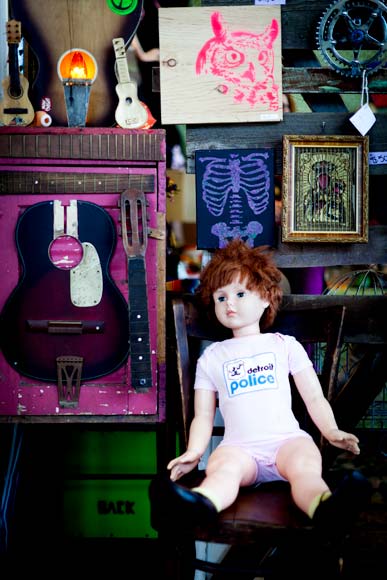 The Rust Belt Market is a 15,000-square-foot space where vendors can rent a booth for a day, a weekend, or by the month. Up to 70 vendors can fit; more like 50 to 60 or so fill the market on an average weekend (it’s open Saturdays and Sundays from 11-7). Offerings range from vintage clothing dealers to T-shirt makers and food entrepreneurs to fine artists. And like the cherry atop a very funky cake, there’s live music or a DJ spinning much of the time.