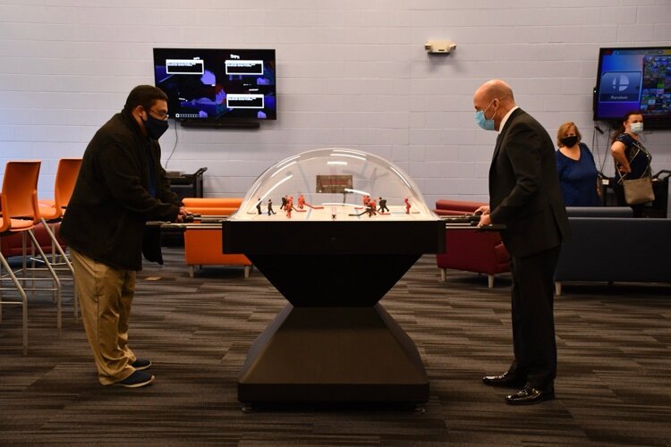 The Esports Arena allows for drop-in, league, and tournament play. A growing list of state-of-the-art equipment includes 12 Alienware Aurora R12 gaming computers with i7 processors, and NVIDIA GeForce RTX 3070 graphics cards. Also on site are two Nintendo Switch controllers, a PlayStation 4, and, for fans of a more analog experience, a Bubble Hockey table.