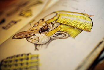 “All of my assignments are solved through my doodles,” he says. “That’s the way I work. I write things down in meetings because I have to.” In the commercial vein, these notes of a different sort help channel his creativity with his work, Helland says. “Some people get on the computer and start designing. I’ll get a piece of paper and crank out a lot more concepts quickly and more efficiently.” In that case, the doodle becomes a functional sketch, rather than an abstract illustration. The idea develops through scribbles.