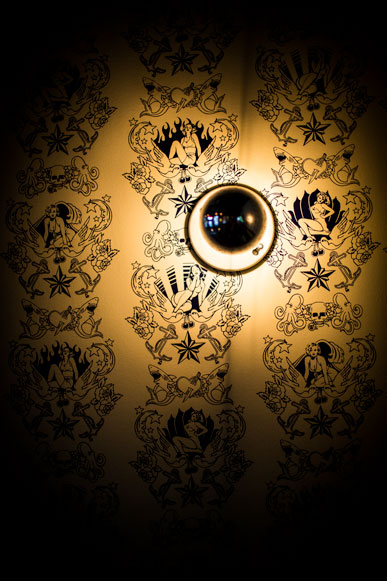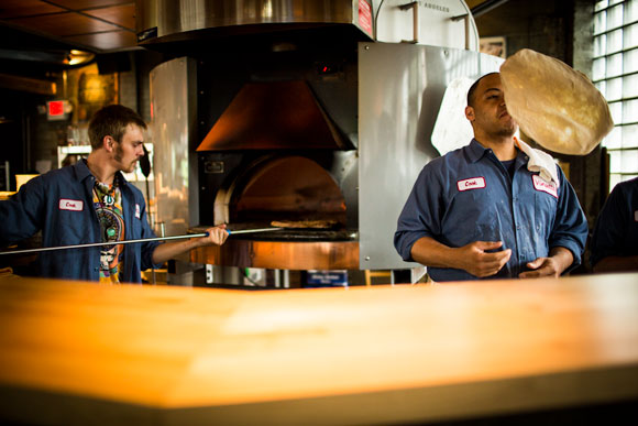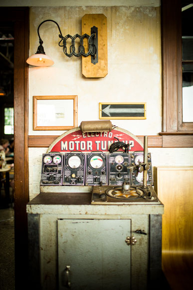 There is no mistaking that Vinsetta was (is) a vintage garage, but with updates:  automobile and racing memorabilia, old repair receipts as wallpaper, bathroom floors laid with pennies, glass from the old skylights made into clouds that hang over the pizza oven, on the walls of a private dining room and on the restroom doors, kitchen staff wear mechanics shirts.