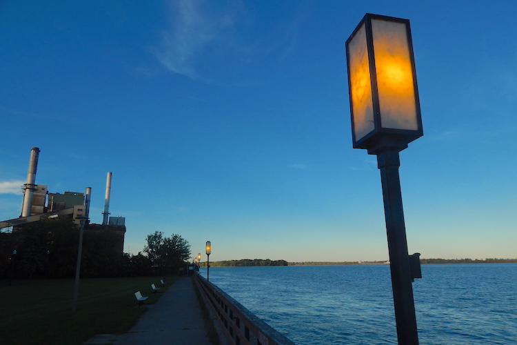 Finally, at the river, as the sun began to fall, I saw shore lights come on along a boardwalk in Bishop Park. Across the water is Fighting Island, once home to Great Lakes native populations, later a toxic depository for chemicals produced on the banks of the river since the late 19th century. Cleanups over the past few years have remediated decades of damage. Deer and coyotes are said to again roam the island,a Canadian territory now owned by the German BASF company, the world’s largest chemicals conglomerate.