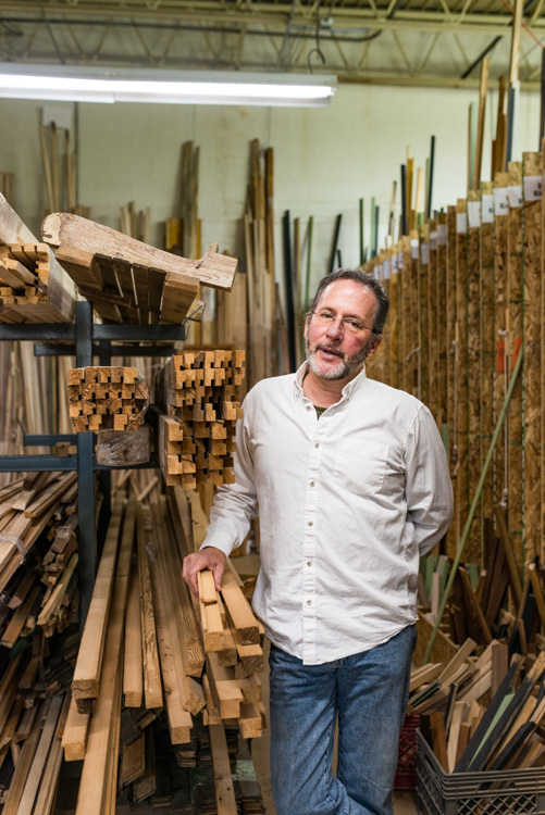 Kelvin Potter, founder of Raven Farm in Bath, started using reclaimed lumber because he was a woodworker who could not afford wood. So he started asking his landscaper friends to save big logs for him from trees they cut down for firewood.